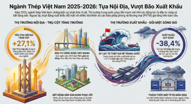 Trong bối cảnh toàn cầu đầy thách thức này, thị trường thép Việt Nam đã chứng kiến một sự phân hóa rõ rệt chưa từng có giữa kênh tiêu thụ nội địa và kênh xuất khẩu.
