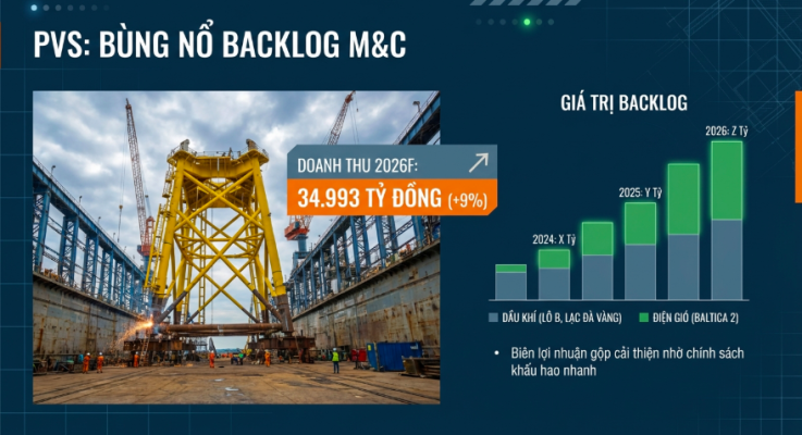 - Luận điểm đầu tư: PVS sẽ là đơn vị hưởng lợi lớn nhất từ khối lượng công việc khổng lồ của các siêu dự án trong nước như Lô B, Lạc Đà Vàng, và Sư Tử Trắng 2B. Chính sách khấu hao nhanh các tài sản phục vụ mảng Cơ khí & Xây dựng (M&C) trong giai đoạn 2023-2025 đang tạm thời đè nén biên lợi nhuận. Tuy nhiên, từ năm 2026, khi gánh nặng khấu hao này kết thúc, chúng tôi dự báo biên lợi nhuận gộp của mảng M&C sẽ có sự cải thiện đột biến, trở thành động lực tăng trưởng lợi nhuận chính cho PVS.