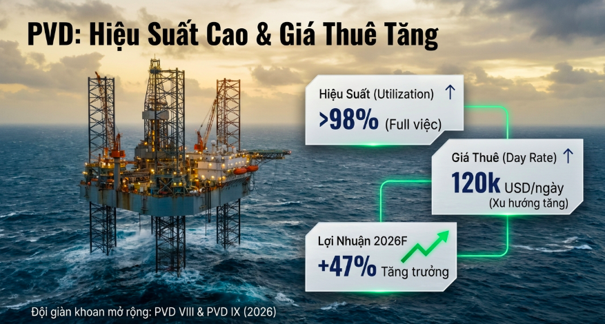 - Luận điểm đầu tư: PVD đang hoạt động trong một môi trường kinh doanh lý tưởng với giá thuê giàn và hiệu suất hoạt động duy trì ở mức cao do nguồn cung giàn khoan trong khu vực còn hạn chế. Việc đầu tư giàn khoan mới PVD IX sẽ tạo động lực tăng trưởng mới ngay từ năm 2026. Đồng thời, mảng dịch vụ kỹ thuật giếng khoan sẽ phục hồi mạnh mẽ khi các chiến dịch khoan tại các dự án nội địa được tái khởi động đồng loạt.