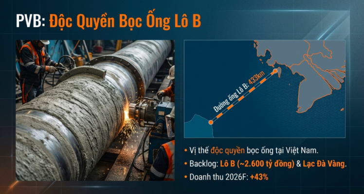 - Luận điểm đầu tư: PVB là doanh nghiệp duy nhất tại Việt Nam có khả năng thực hiện bọc ống cho các dự án ngoài khơi quy mô lớn, biến siêu dự án Lô B thành một nguồn doanh thu gần như chắc chắn và có thể dự báo trước. Khối lượng công việc từ đường ống dài 433km của dự án này sẽ đảm bảo tăng trưởng vượt bậc cho công ty. Triển vọng dài hạn tiếp tục được củng cố bởi các dự án tiềm năng khác như Sư Tử Trắng 2B và Cá Voi Xanh.