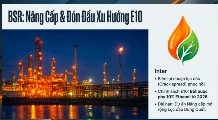 - Luận điểm đầu tư: BSR sẽ hưởng lợi trực tiếp khi crack spread tại châu Á được kỳ vọng tiếp tục phục hồi. Ngoài ra, lộ trình bắt buộc chuyển đổi sang xăng E10 trên toàn quốc sẽ là cú hích cho sản lượng tiêu thụ. Về dài hạn, dự án Nâng cấp Mở rộng Nhà máy Lọc dầu Dung Quất sẽ là động lực tăng trưởng chính, giúp nâng cao công suất và hiệu quả hoạt động.