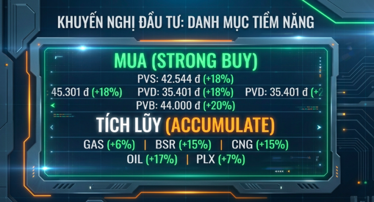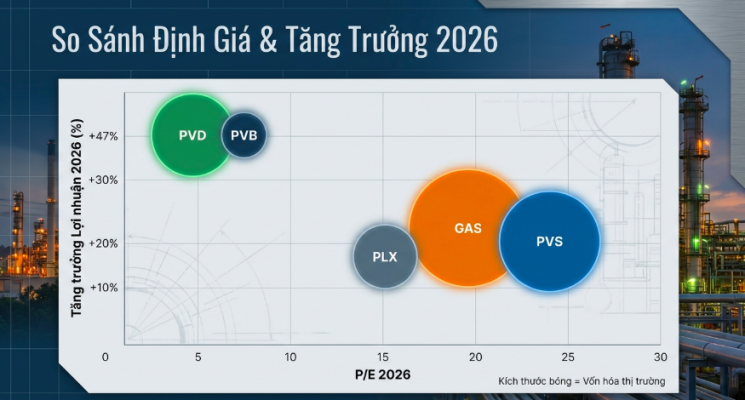 Dựa trên các động lực này, chúng tôi nhận định nhóm doanh nghiệp thượng nguồn (PVS, PVD, PVB) sẽ là những đơn vị hưởng lợi rõ nét và sớm nhất, trực tiếp thu về dòng tiền từ các hợp đồng dịch vụ, xây lắp và khoan. Trong khi đó, các doanh nghiệp trung và hạ nguồn (GAS, BSR, PLX, OIL) sẽ có sự phục hồi và tăng trưởng bền vững hơn trong dài hạn, được thúc đẩy bởi nhu cầu tiêu thụ năng lượng ổn định của nền kinh tế và xu hướng chuyển dịch năng lượng chiến lược của quốc gia. Do đó, chúng tôi nhận định chiến lược đầu tư tối ưu trong giai đoạn đầu của chu kỳ sẽ tập trung vào các doanh nghiệp thượng nguồn có backlog lớn và định giá hấp dẫn, trước khi dần chuyển dịch sang các doanh nghiệp trung và hạ nguồn khi hiệu ứng lan tỏa từ thượng nguồn trở nên rõ rệt hơn.