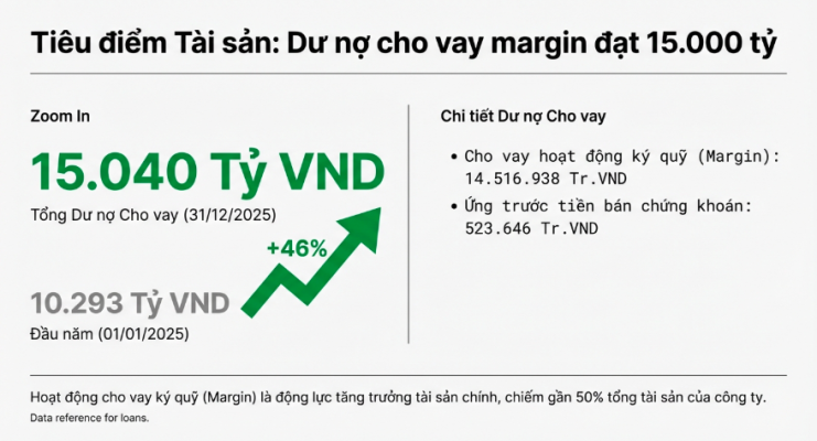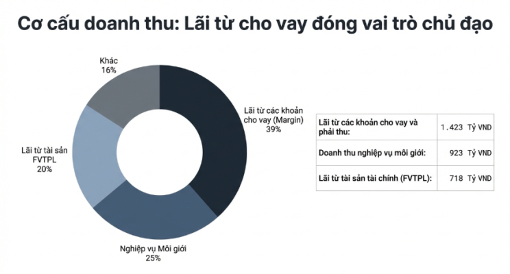 • Các tài sản tài chính FVTPL (Tự doanh): đạt 3,104 tỷ đồng, chiếm 10.1% tổng tài sản ngắn hạn, cho thấy hoạt động tự doanh vẫn là một mảng kinh doanh quan trọng của công ty.