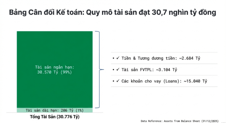 Cấu trúc tài sản ngắn hạn của MBS phản ánh rõ nét mô hình kinh doanh và các rủi ro đi kèm. Tại ngày 31/12/2025, trong tổng tài sản ngắn hạn khoảng 30,570 tỷ đồng, các khoản mục lớn nhất bao gồm: