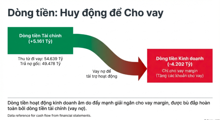 Về dòng tiền, Báo cáo lưu chuyển tiền tệ (trang 12) cho thấy dòng tiền thuần từ hoạt động kinh doanh âm 4,203 tỷ đồng. Con số này là đặc thù của ngành chứng khoán và không nhất thiết là tín hiệu tiêu cực. Cụ thể, dòng tiền kinh doanh âm chủ yếu do dòng tiền chi ra cho “Các khoản cho vay” tăng mạnh thêm 4,747 tỷ đồng, một hoạt động được phân loại là kinh doanh đối với công ty chứng khoán. Điều này kết nối trực tiếp sự tăng trưởng trên Bảng cân đối kế toán với thực tế dòng tiền, đồng thời cho thấy MBS phụ thuộc lớn vào dòng tiền từ hoạt động tài chính (chủ yếu là đi vay) để tài trợ cho sự tăng trưởng này.