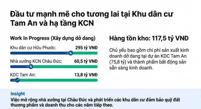 • Hàng tồn kho: Giá trị hàng tồn kho duy trì ổn định ở mức 117,5 tỷ VND so với 117,3 tỷ VND đầu năm, chủ yếu là chi phí sản xuất kinh doanh dở dang và thành phẩm bất động sản.