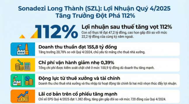 Điểm sáng lớn nhất trong bức tranh tài chính Quý 4/2025 của SZL chính là sự tăng trưởng vượt bậc của lợi nhuận. Theo công văn giải trình của công ty, lợi nhuận sau thuế đã tăng vọt 112% so với cùng kỳ năm 2024.