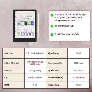 Meebook M8C sử dụng chip 8 nhân 1.8GHz, RAM 4GB và bộ nhớ trong 64GB, hỗ trợ thẻ nhớ lên đến 1TB, đảm bảo không gian lưu trữ khổng lồ. Với hệ điều hành Android 14, bạn có thể cài đặt thêm các ứng dụng đọc sách, nghe sách nói hay thậm chí cả ứng dụng văn phòng như Word, Excel, PowerPoint… giúp M8C không chỉ là máy đọc sách mà còn là công cụ học tập và làm việc tiện lợi.